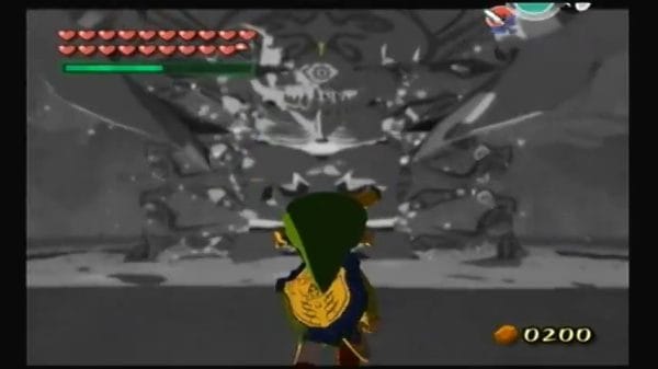 في تلك اللحظة، ارفع درعك المرآوي. سيرتد السهم الضوئي عن درعك ويصيب غانوندورف من زاوية غير متوقعة، مما يُصعقه تمامًا. (إذا أخطأ، استمر في المناورة وحاول مرة أخرى - قد تحتاج إلى الوقوف ساكنًا عمدًا لإغراء غانوندورف بالهجوم، مما يمنح زيلدا فرصة واضحة لإصابة درعك). بمجرد أن يُشل غانوندورف بفعل السهم الضوئي المنعكس، اغتنم الفرصة: اركض نحوه واضغط على زر A. ضربة نهائية سيظهر موجه. يقفز الرابط في الهواء، وبطريقة درامية وواقعية إلى حد ما بشع الحركة النهائية، تقود السيف الرئيسي مباشرة في جبهة جانوندورفحوّله إلى حجر. تهانينا - لقد هزمتَ سيد الظلام!
